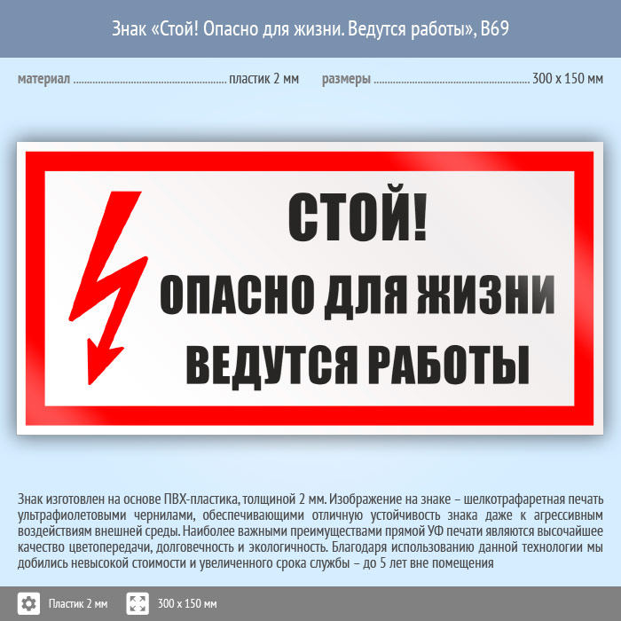 Знак «Стой! Опасно для жизни. Ведутся работы», B69 (пластик, 300х150 мм) в Курске купить