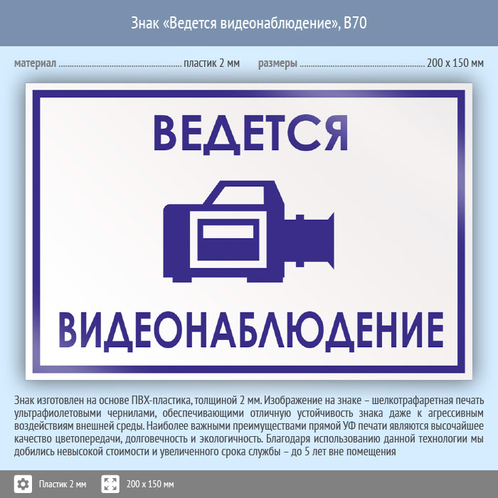 Знак «Ведется видеонаблюдение», B70 (пластик, 200х150 мм) в Курске купить