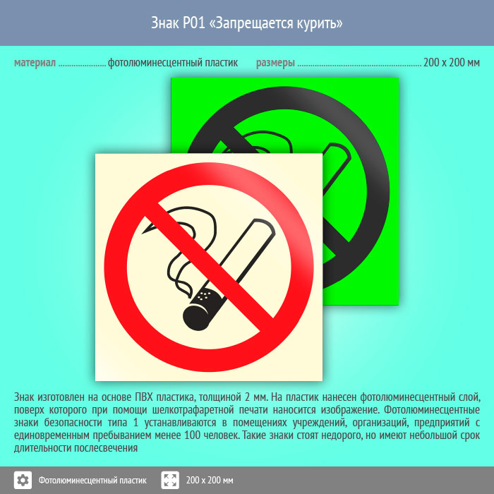 Знак P01 «Запрещается курить» (фотолюминесцентный пластик, 200х200 мм) в Курске купить