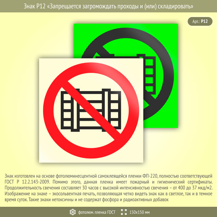 Знак P12 «Запрещается загромождать проходы и (или) складировать» (фотолюминесцентная пленка ГОСТ 34428-2018, 150х150 мм) в Курске купить