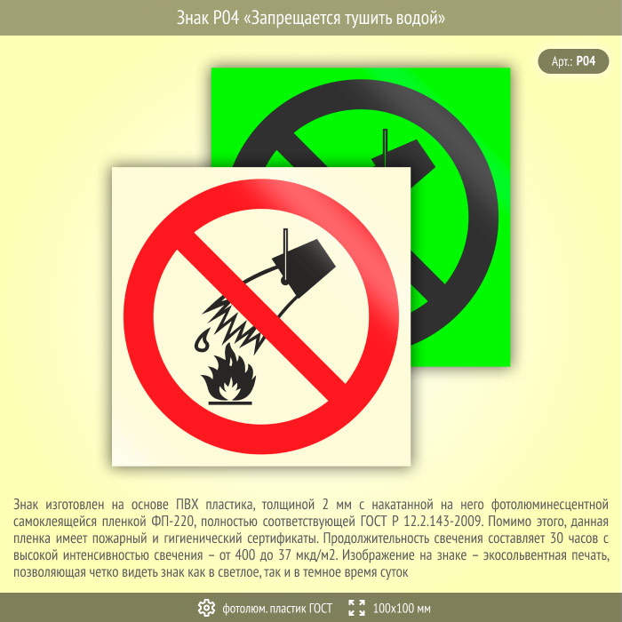 Знак P04 «Запрещается тушить водой» (фотолюминесцентный пластик ГОСТ 34428-2018, 100х100 мм) в Курске купить