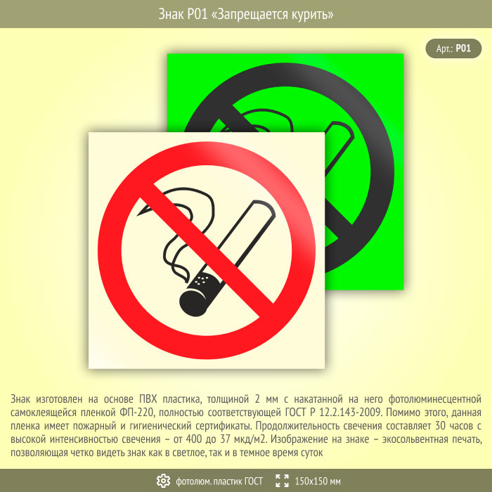 Знак P01 «Запрещается курить» (фотолюминесцентный пластик ГОСТ 34428-2018, 150х150 мм) в Курске купить