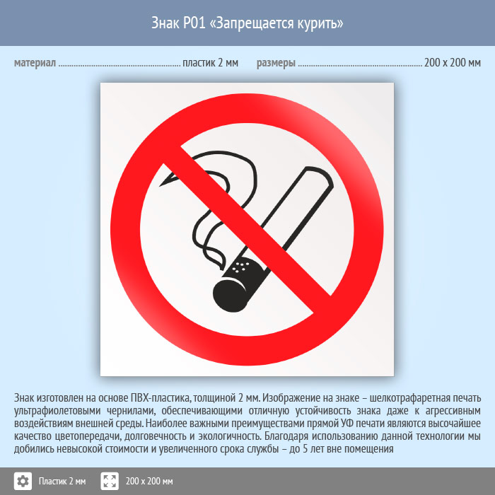Знак P01 «Запрещается курить» (пластик, 200х200 мм) в Курске купить
