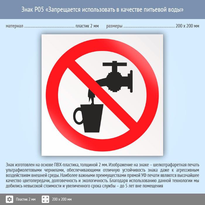 Знак P05 «Запрещается использовать в качестве питьевой воды» (пластик, 200х200 мм) в Курске купить