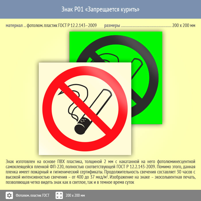 Знак P01 «Запрещается курить» (фотолюминесцентный пластик ГОСТ 34428-2018, 200х200 мм) в Курске купить