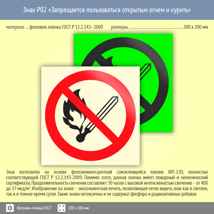 Знак P02 «Запрещается пользоваться открытым огнем и курить» (фотолюминесцентная пленка ГОСТ 34428-2018, 200х200 мм) в Курске купить