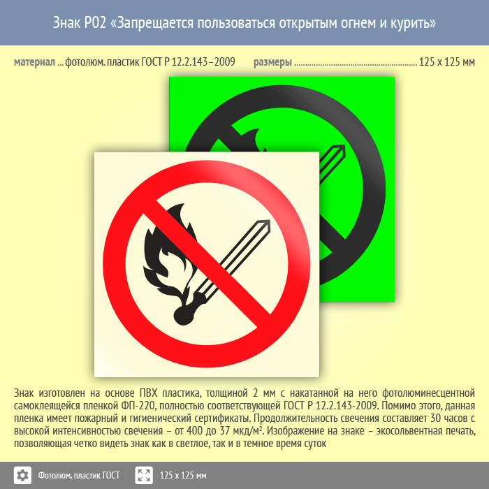Знак P02 «Запрещается пользоваться открытым огнем и курить» (фотолюминесцентный пластик ГОСТ 34428-2018, 125х125 мм) в Курске купить