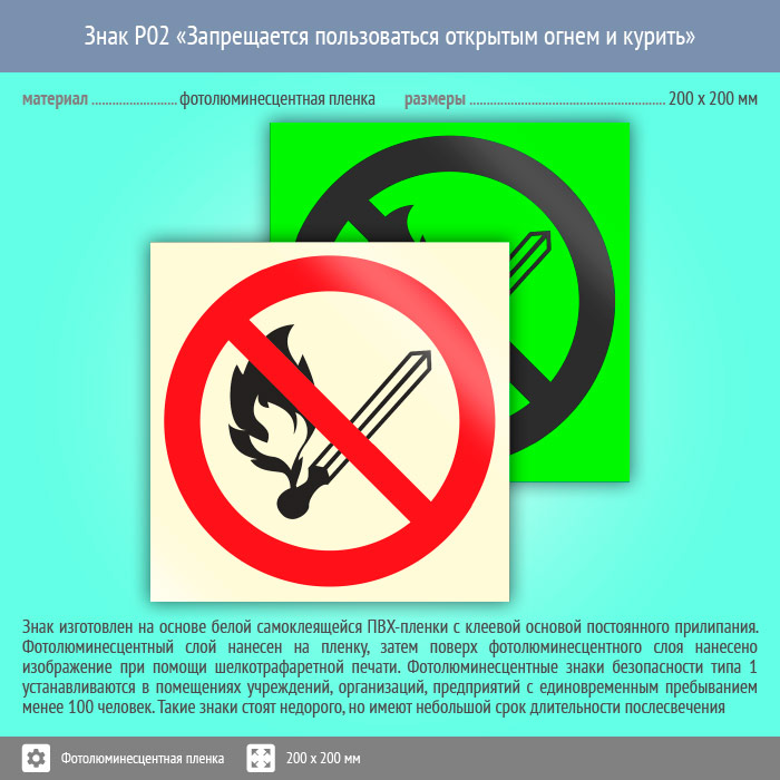 Знак P02 «Запрещается пользоваться открытым огнем и курить» (фотолюминесцентная пленка, 200х200 мм) в Курске купить