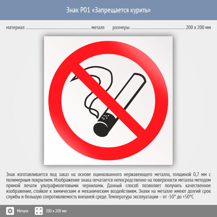 Знак P01 «Запрещается курить» (металл, 200х200 мм) в Курске купить