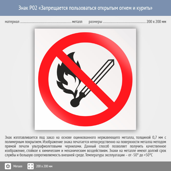 Знак P02 «Запрещается пользоваться открытым огнем и курить» (металл, 200х200 мм) в Курске купить