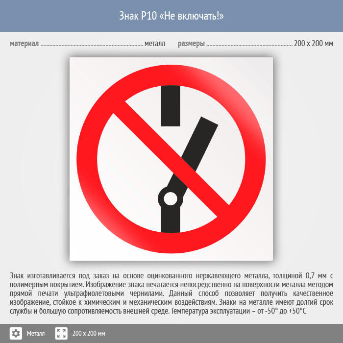 Знак P10 «Не включать!» (металл, 200х200 мм) в Курске купить