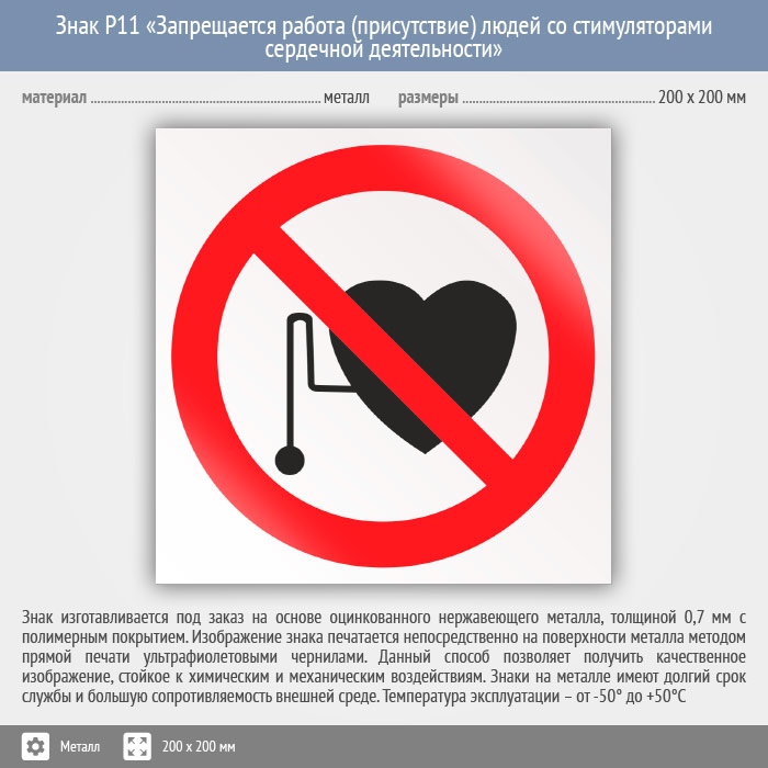 Знак P11 «Запрещается работа (присутствие) людей со стимуляторами сердечной деятельности» (металл, 200х200 мм) в Курске купить