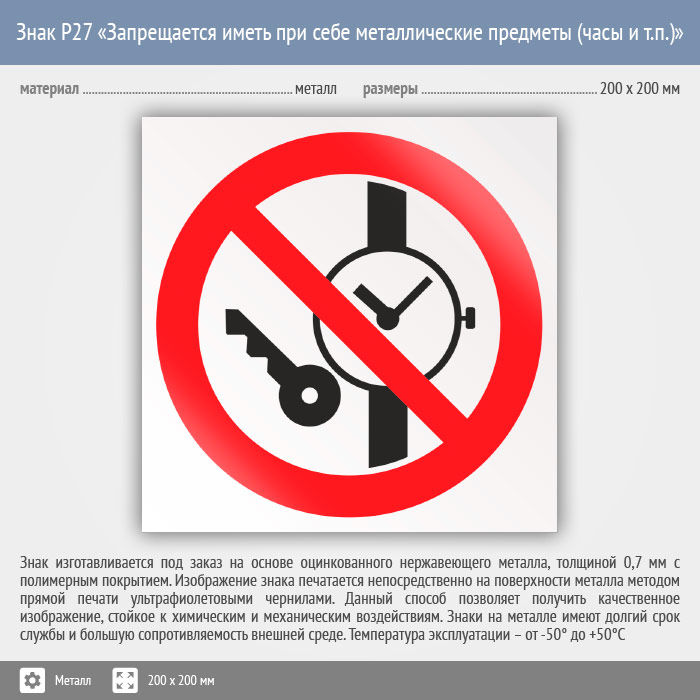 Знак P27 «Запрещается иметь при (на) себе металлические предметы (часы и т.п.)» (металл, 200х200 мм) в Курске купить