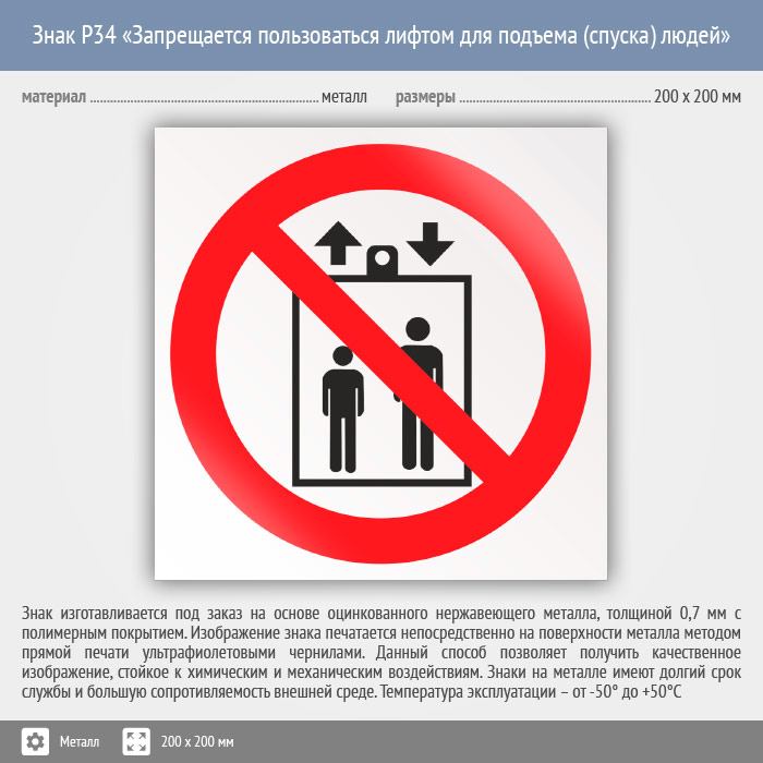 Знак P34 «Запрещается пользоваться лифтом для подъема (спуска) людей» (металл, 200х200 мм) в Курске купить