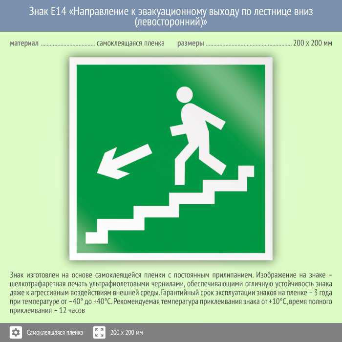 Знак E14 «Направление к эвакуационному выходу по лестнице вниз (левосторонний)» (фотолюм. пленка, 200х200 мм)
