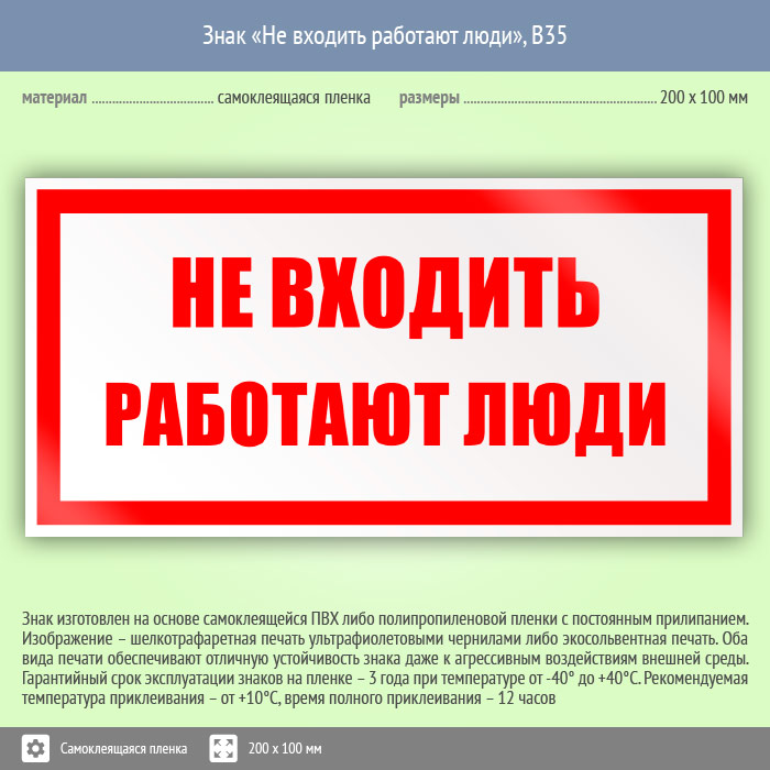 Знак «Не входить работают люди» имеет размер 200х100 мм