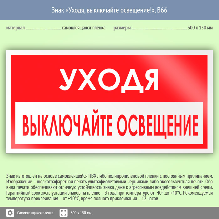 Знак «Уходя, выключайте освещение!» может быть изготовлен любого размера на самоклеящейся пленке, пластике толщиной 0.5, 2 или 4 мм и металле. Также возможно применение фотолюминесцентных и световозвращающих материалов