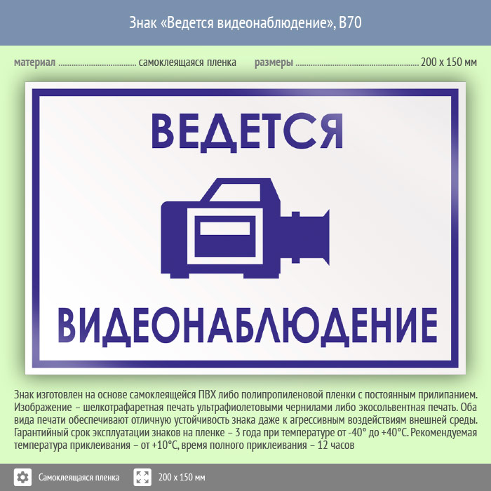 Знак «Ведется видеонаблюдение» имеет размер 200х150 мм