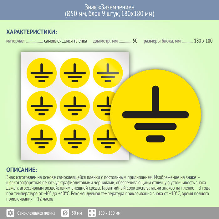 Знак (плакат) «Заземление», S46 (пленка, диаметр 50 мм, блок 9 штук, 180х180 мм) в Курске купить