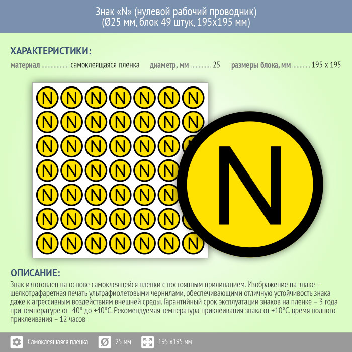 Знак (плакат) «N» (нулевой рабочий проводник), S47 (пленка, диаметр 25 мм, блок 49 штук, 195х195 мм) в Курске купить