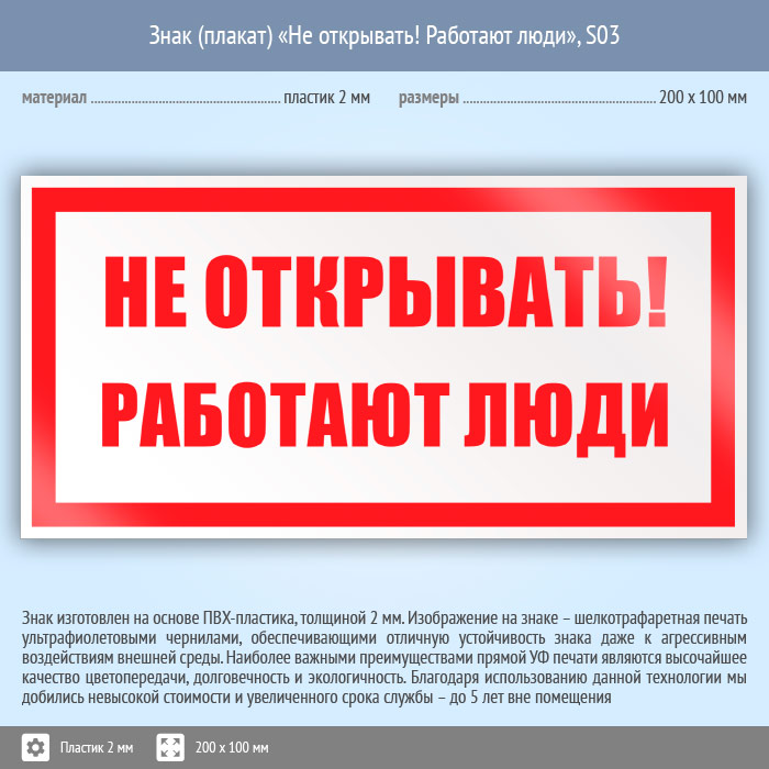 Знак (плакат) «Не открывать! Работают люди», S03 (пластик, 200х100 мм) в Курске купить