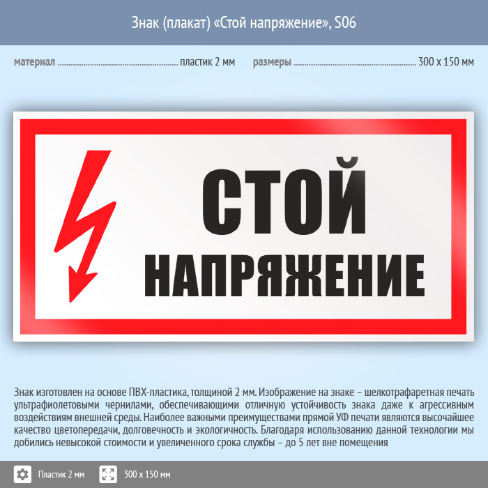 Знак (плакат) «Стой напряжение», S06 (пластик, 300х150 мм) в Курске купить
