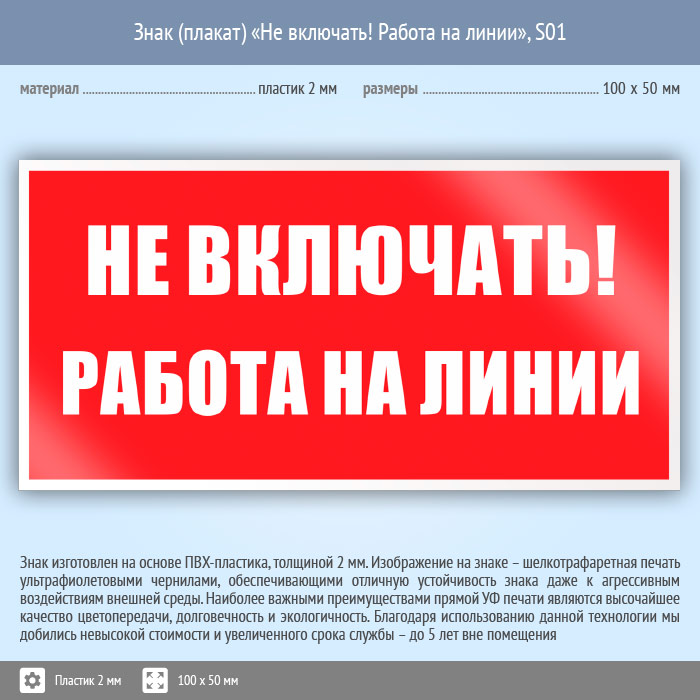 Знак (плакат) «Не включать! Работа на линии», S01 (пластик, 100х50 мм) в Курске купить
