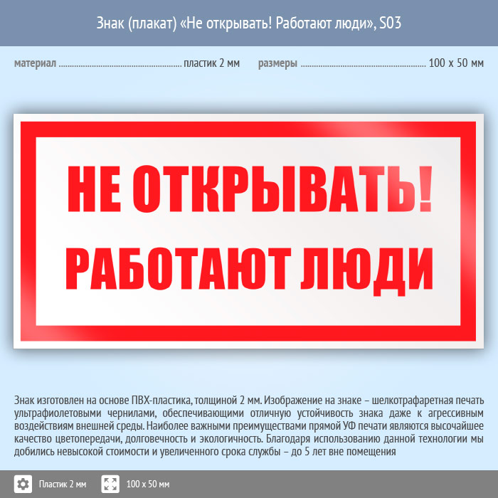 Знак (плакат) «Не открывать! Работают люди», S03 (пластик, 100х50 мм) в Курске купить