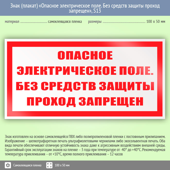 Знак (плакат) «Опасное электрическое поле. Без средств защиты проход запрещен», S13 (пленка, 100х50 мм) в Курске купить