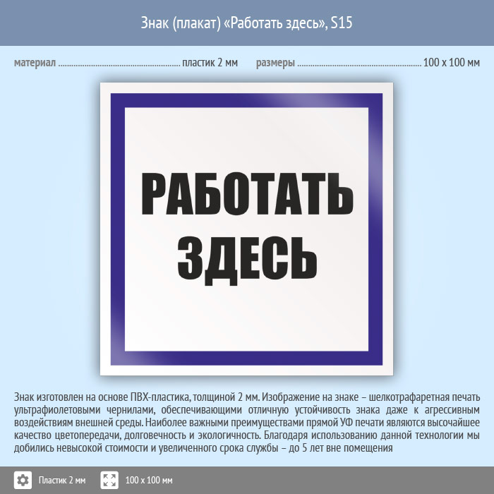 Знак (плакат) «Работать здесь», S15 (пластик, 100х100 мм) в Курске купить