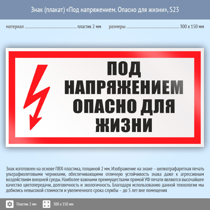Знак (плакат) «Под напряжением. Опасно для жизни», S23 (пластик, 300х150 мм) в Курске купить