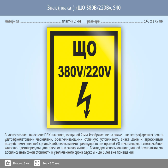 Знак (плакат) «ЩО 380В/220В», S40 (пластик, 145х175 мм) в Курске купить