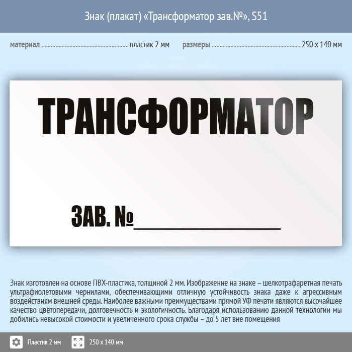 Знак (плакат) «Трансформатор зав.№», S51 (пластик, 250х140 мм) в Курске купить