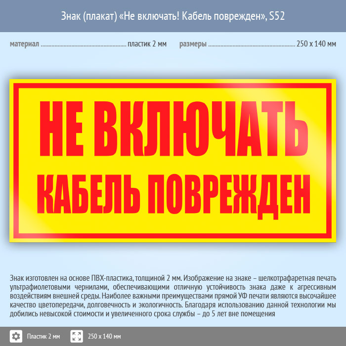 Знак (плакат) «Не включать! Кабель поврежден», S52 (пластик, 250х140 мм) в Курске купить