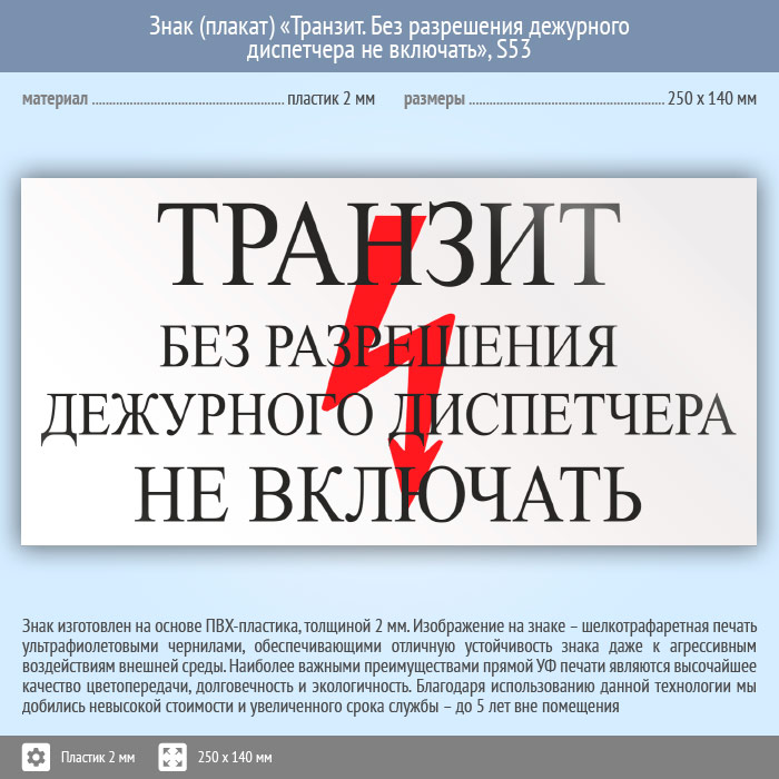 Знак (плакат) «Транзит. Без разрешения дежурного диспетчера Не включать», S53 (пластик, 250х140 мм) в Курске купить