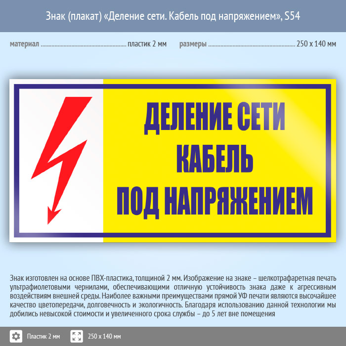 Знак (плакат) «Деление сети. Кабель под напряжением», S54 (пластик, 250х140 мм) в Курске купить