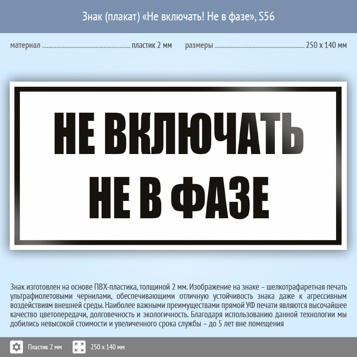 Знак (плакат) «Не включать! Не в фазе», S56 (пластик, 250х140 мм) в Курске купить