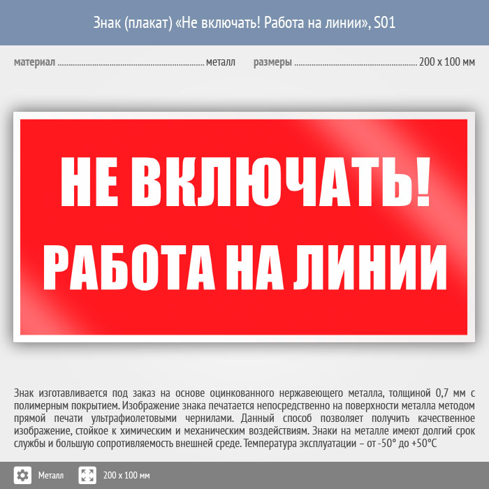 Знак (плакат) «Не включать! Работа на линии», S01 (металл, 200х100 мм) в Курске купить