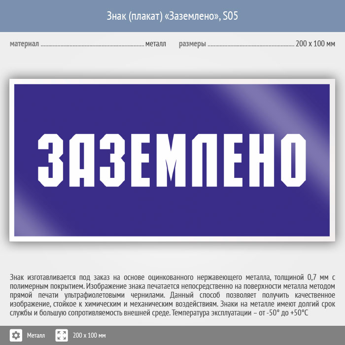 Знак (плакат) «Заземлено», S05 (металл, 200х100 мм) в Курске купить