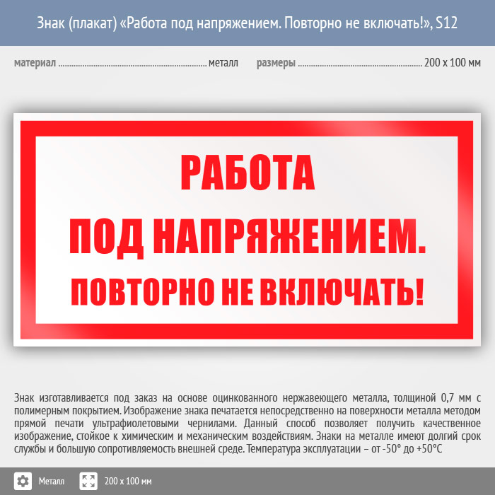 Знак (плакат) «Работа под напряжением. Повторно не включать!», S12 (металл, 200х100 мм) в Курске купить