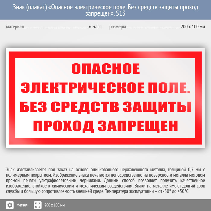 Знак (плакат) «Опасное электрическое поле. Без средств защиты проход запрещен», S13 (металл, 200х100 мм) в Курске купить