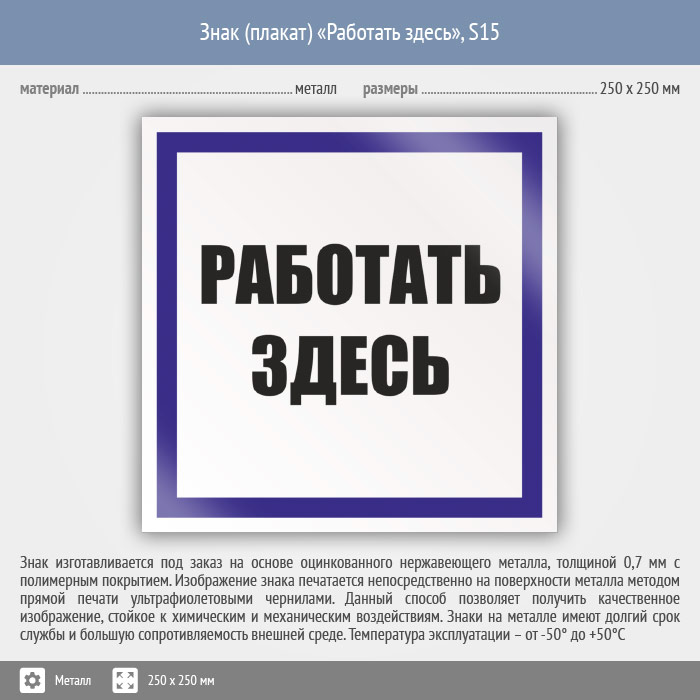 Знак (плакат) «Работать здесь», S15 (металл, 250х250 мм) в Курске купить