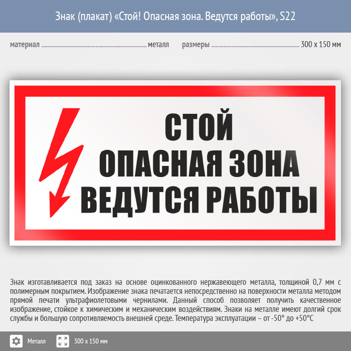 Знак (плакат) «Стой! Опасная зона. Ведутся работы», S22 (металл, 300х150 мм) в Курске купить