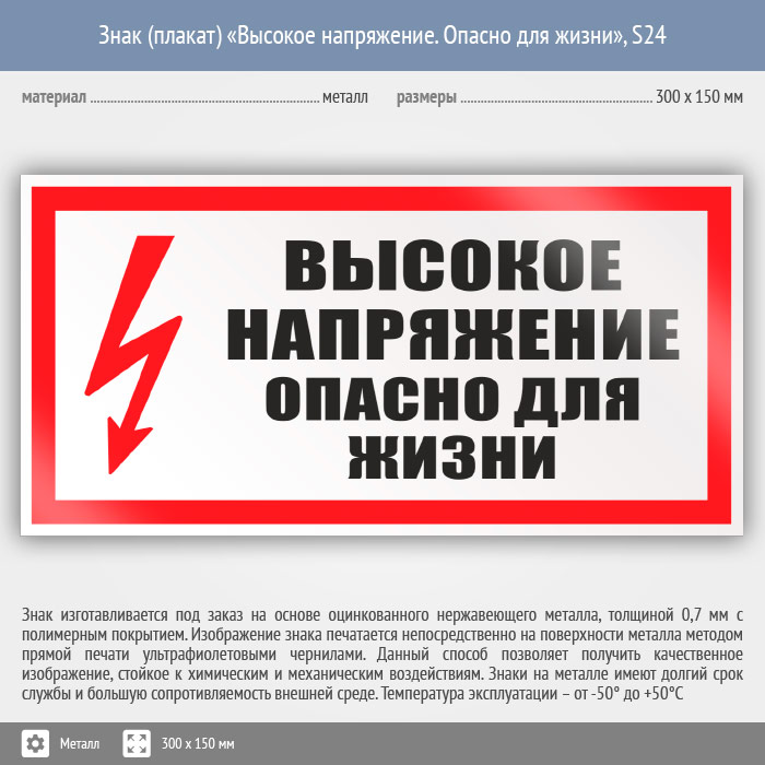 Знак (плакат) «Высокое напряжение. Опасно для жизни», S24 (металл, 300х150 мм) в Курске купить
