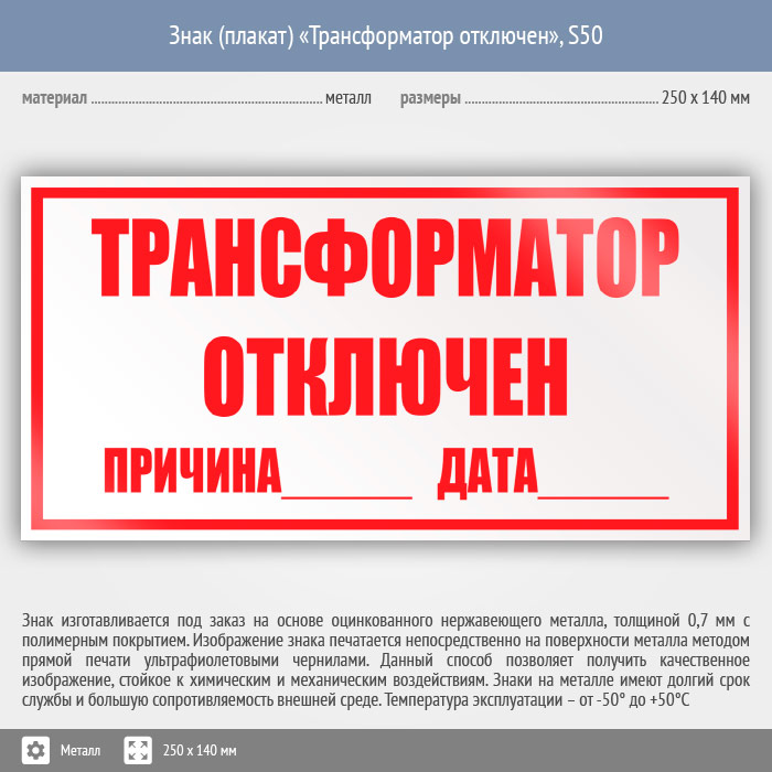 Знак (плакат) «Трансформатор отключен», S50 (металл, 250х140 мм) в Курске купить