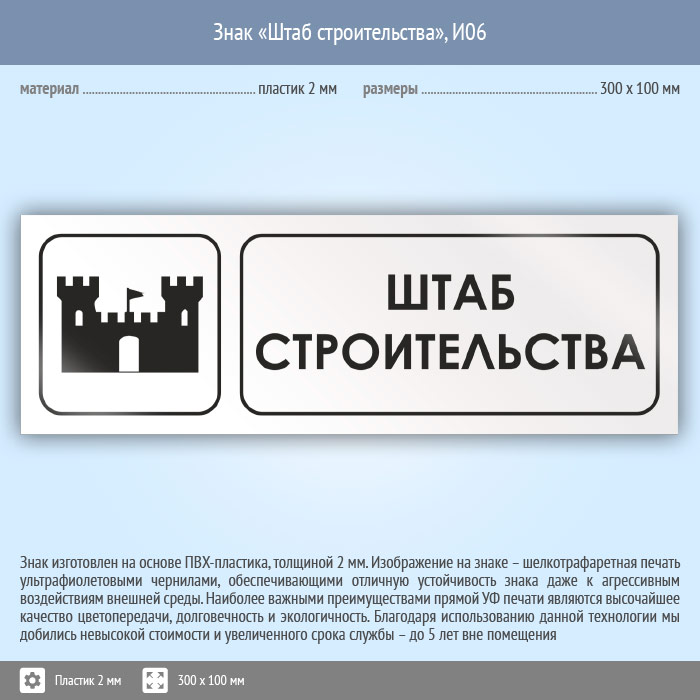 Знак «Штаб строительства», И06 (пластик, 300х100 мм) в Курске купить