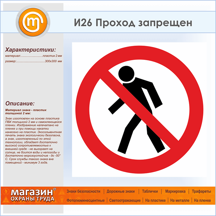 Знак «Проход запрещен», И26 (пластик, 300х300 мм) в Курске купить