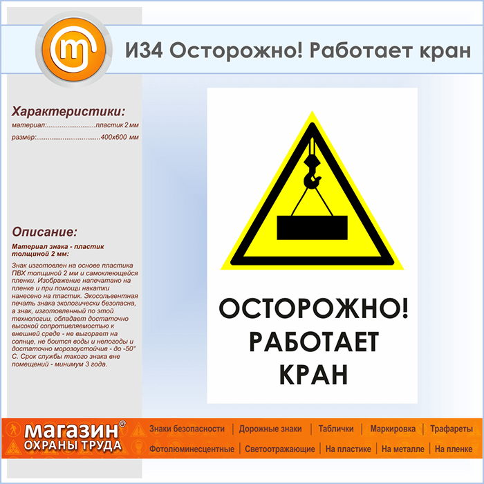 Знак «Осторожно! Работает кран», И34 (пластик, 400х600 мм) в Курске купить