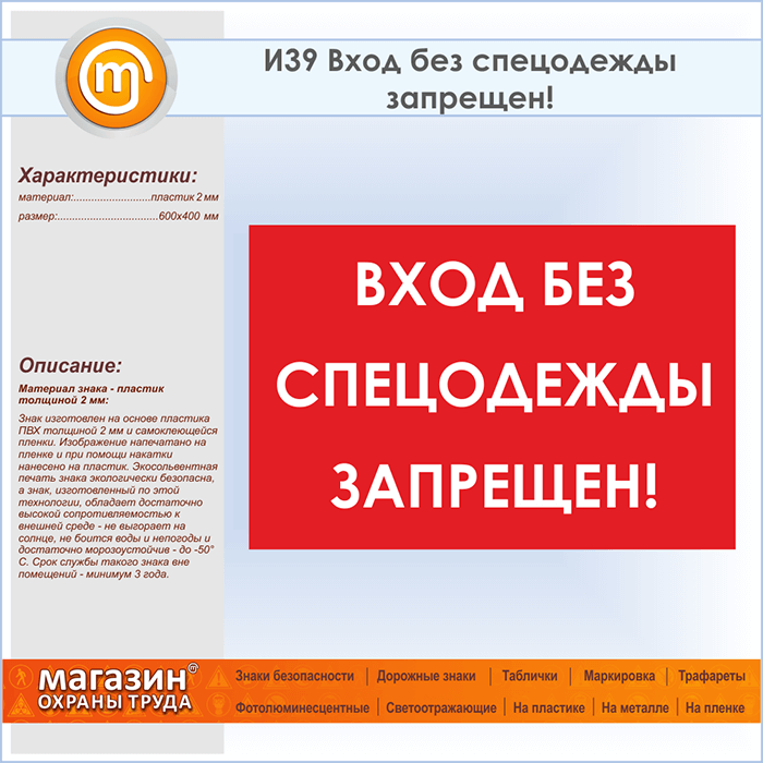 Знак «Вход без спецодежды запрещен!», И39 (пластик, 600х400 мм) в Курске купить