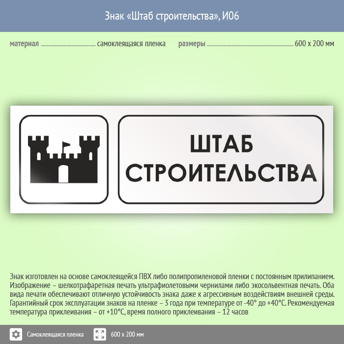 Знак «Штаб строительства», И06 (пленка, 600х200 мм) в Курске купить